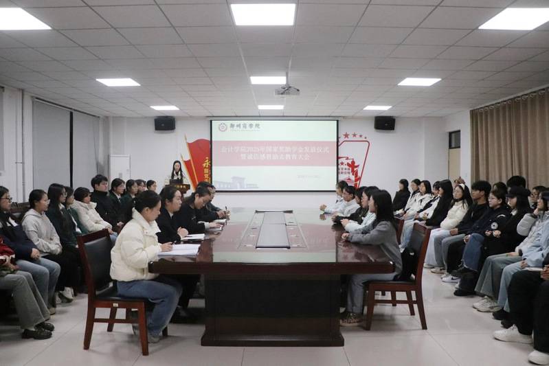 11月26日,会计学院在广恩楼103会议室举办2025年国家奖助学金发放仪式暨诚信感恩励志教育大会。会上,党委书记刘宏涛进行了总结发言,他勉励同学们认清资助意义、合理规划消费,常怀感恩之心、勤学奋进,以实际行动爱国爱校、回报社会。此次大会让学子切实感受到国家与学校的关怀,激励大家苦练技能、争做优秀郑商学子。
