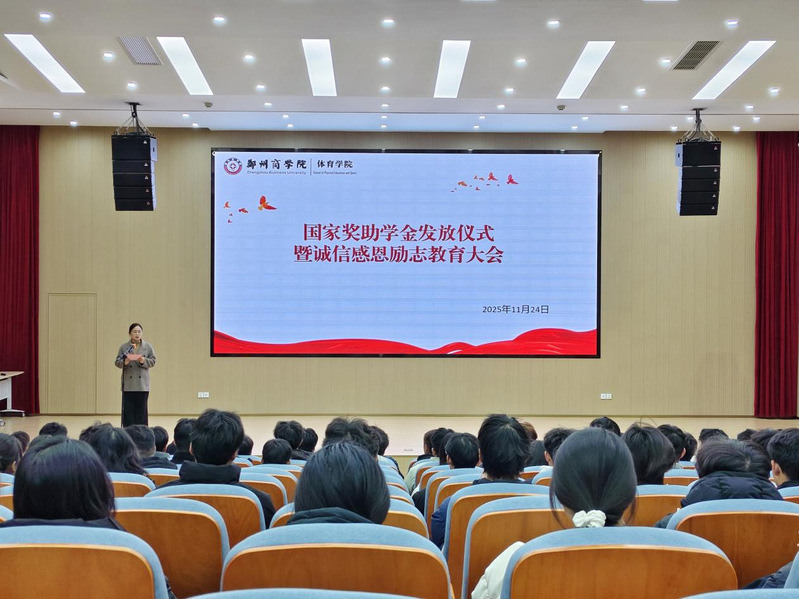 11月24日下午,体育学院在体育馆报告厅举行2025年国家奖助学金发放仪式暨诚信感恩励志教育大会。学院党委书记刘健、校资助管理中心科长王晶晶、团委书记丁震霆、全体辅导员及获奖受助学生参会。此次大会的召开,让同学们深切感受到了国家、社会、学校对他们成长成才的重视与关心,更坚定了同学们励志成才、回报社会的决心。