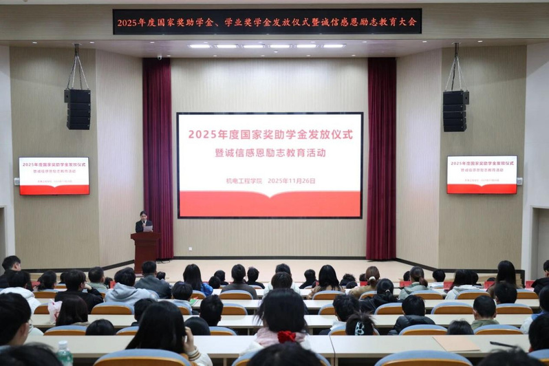 11月26日中午,机电工程学院在躬行楼报告厅举行了2025年国家奖助学金发放仪式暨诚信感恩励志教育活动。会上,学院党委书记杨茗涵作总结讲话,勉励大家要常怀感恩之心,恪守诚信之本,矢志艰苦奋斗,努力成长为堪当民族复兴大任的时代新人。本次活动是一堂生动的思想政治教育课,激励着广大学子砥砺前行。