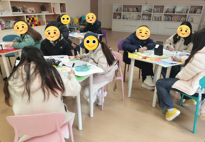 活动遵循“身心放松—内心投射—艺术表达—情感共鸣”的内在逻辑,层层递进。同学们首先在引导下通过音乐放松与呼吸调适逐步进入平静状态,借助OH卡进行自由联想,让内心的压力与情绪自然浮现。随后,在轻柔的音乐中,同学们展开创作,用色彩、线条将无形的压力转化为可触摸、可命名的艺术表达。在分享环节,大家敞开心扉,描述画作背后的情感故事,共同见证彼此的感受与力量。