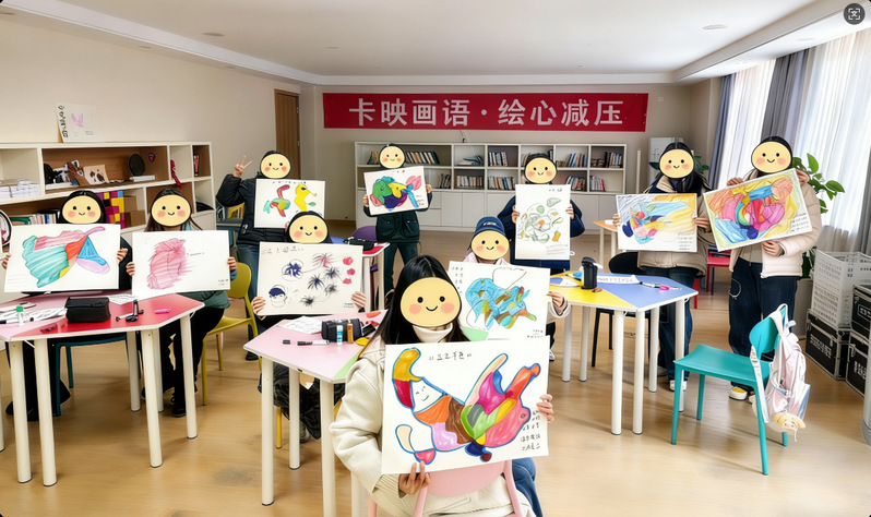 郭晓峰老师在活动总结中分享了四种日常可操作的减压方法——音乐放松、艺术宣泄、正念专注及OH卡对话,鼓励同学们将团辅中的体验转化为日常自我关怀的实践。在温暖的乐曲声中,同学们共同举起自己的画作,互相致意,为这场心灵对话画下了富有仪式感的句号。