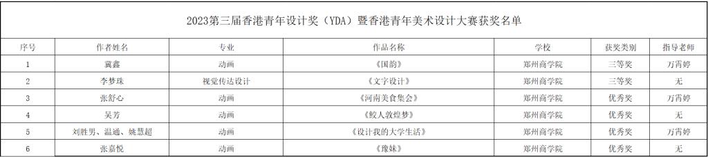 近日,由香港青年美术家协会主办的2023第三届香港青年设计奖(YDA)暨香港青年美术设计大赛获奖结果出炉,我院学生喜获三等奖2项,优秀奖4项。
