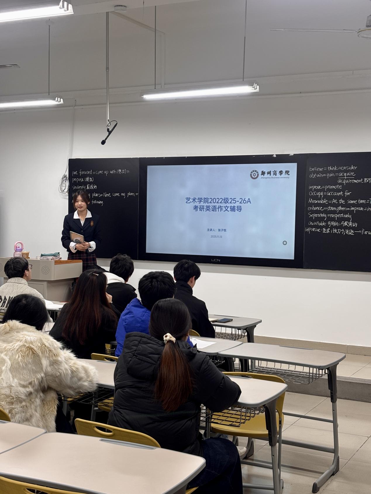 11月13日,我院考研组环境设计专业的张子悦老师针对艺术学院4个专业的2022级考研学子,在晚自习时间为大家带来了一场别开生面的考研英语作文的专项辅导课。她以自身丰富的留学经历与艺术创作背景为依托,将国际视野与本土应试需求深度融合,为艺术类考生量身打造了一场提分特训。区别于传统模板化教学,张老师根据之前在专业课课堂中学生的表现和反映情况,重构了艺术生英语写作的认知体系。