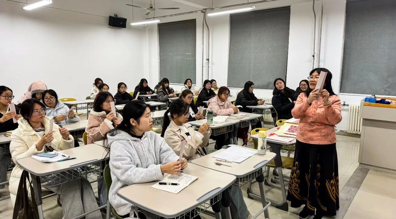 接着,伴随巩义河洛剪纸的文化视频播放,曹老师结合视频讲解了从古老民间习俗到当代艺术创新的传承脉络,千年非遗的文化底蕴在课堂中缓缓铺展。实操环节里,曹老师俯身指导折叠角度与剪刻力度,原本生疏的学子们逐渐掌握技巧,当一张张鲜红“双喜”展开时,教室内漾起惊喜的赞叹。