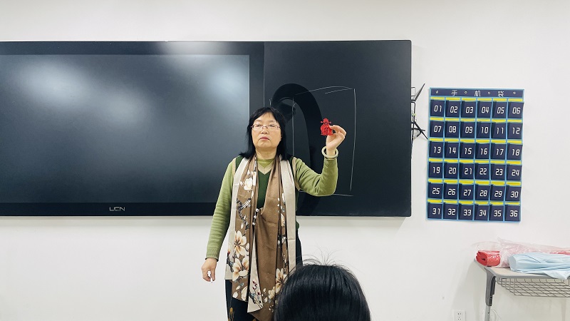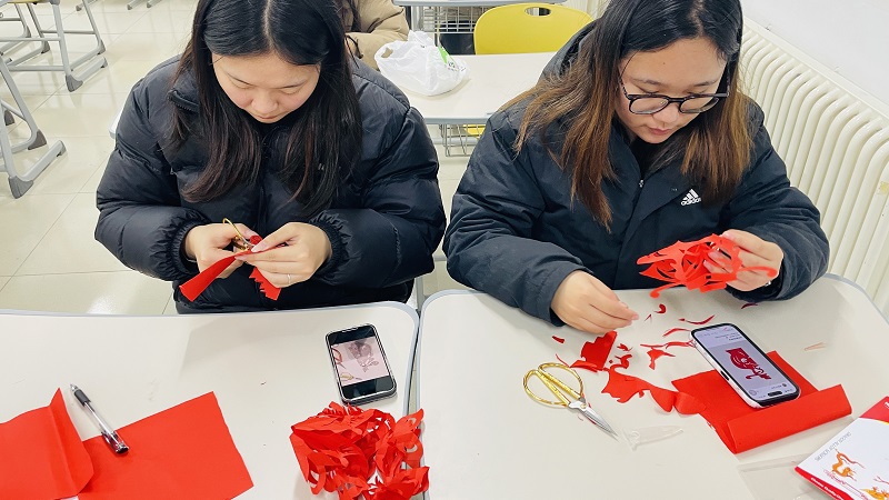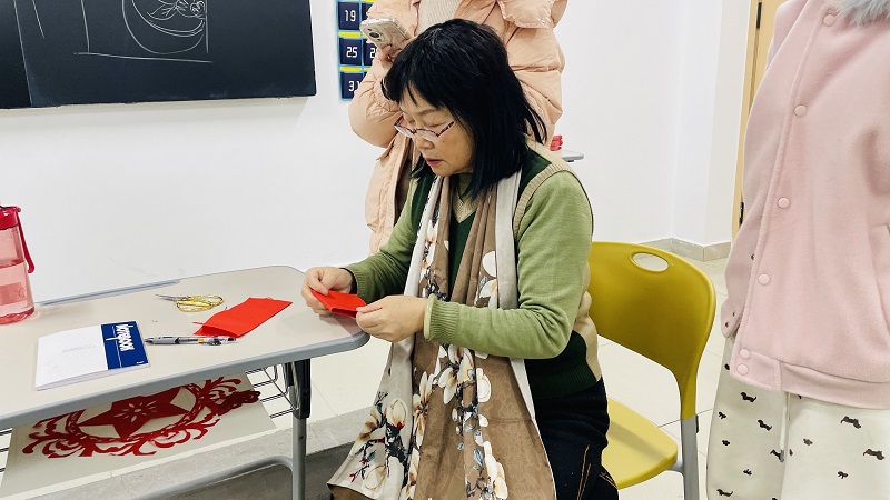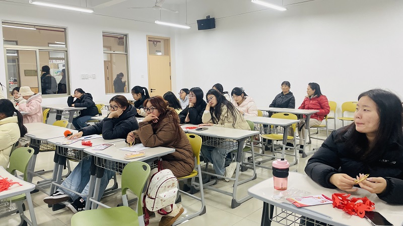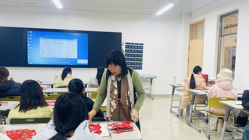 实操环节中,同学们手持红纸与剪刀认真创作,遇到图案刻画难点便主动请教,老师们则耐心指导剪纸弧度把控、线条疏密等技巧。一张张红纸在指尖化作鲜活的“小财神”,满室洋溢着剪纸艺术的趣味与温度。