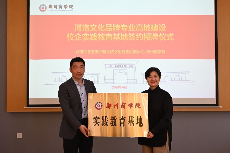 签约完成后,刘升阳副校长、郑州市非遗保护和文旅文创融合发展中心主任李桂玲共同上台,为郑州商学院教育实践基地完成授牌交接,现场掌声热烈,共同见证校地携手育人的全新起点。