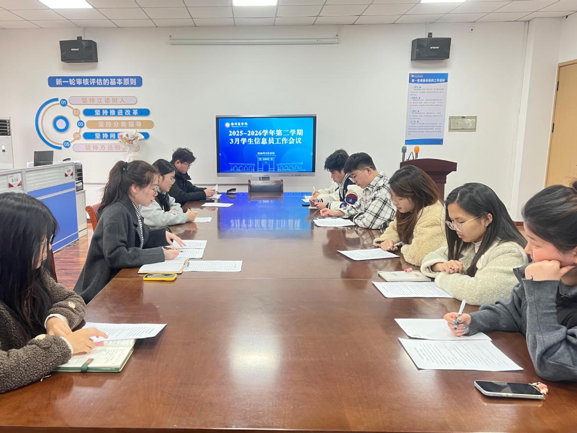 3月23日下午,质评中心在2号楼115会议室组织召开了2025-2026学年第二学期学生信息员期初工作会议。学院教学信息工作组组长(学生信息员代表)、质评中心办公室成员参加了会议,会议由郭婷婷老师主持。